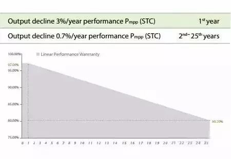 上图中第一年3%的总衰减数据取自某公司光伏组件的25年衰减保证当中,其25年衰减保证如图4-2所示: